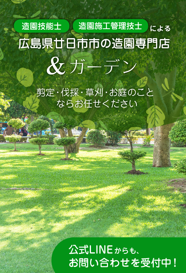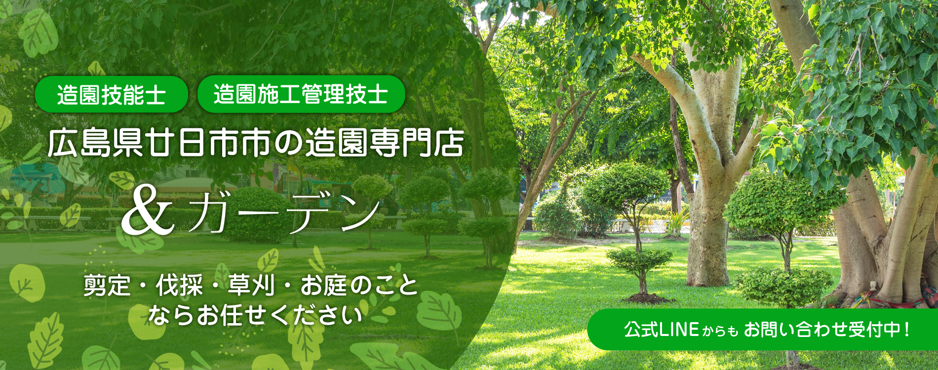 &ガーデンは広島県廿日市市を拠点に、お庭の剪定・伐採・草刈り・防草シート施工などを手がける造園専門店として、地域の皆様の暮らしに寄り添ったサービスを提供しています。